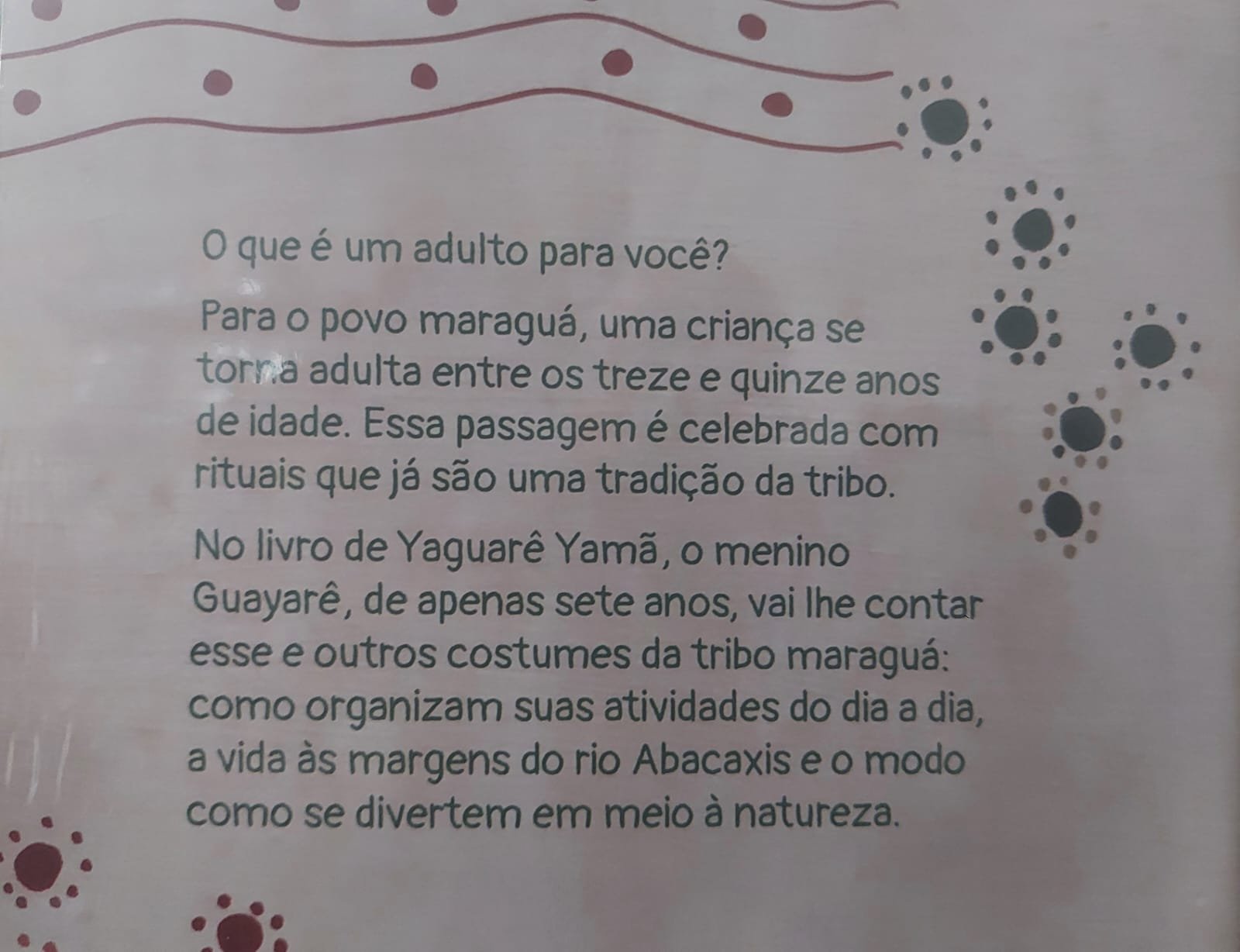 O que é um adulto para você? Para o povo maraguá, uma criança se torna adulta entre os treze e quinze anos de idade. Essa passagem é celebrada com rituais que já são uma tradição da tribo. No livro de Yaguarê Yamã, o menino Guayarê, de apenas sete anos, vai lhe contar esse e outros costumes da tribo maraguá: como organizam suas atividades do dia a dia, a vida às margens do rio Abacaxis e o modo como se divertem em meio à natureza. :: Livro bilíngue: Português/Maraguá ::