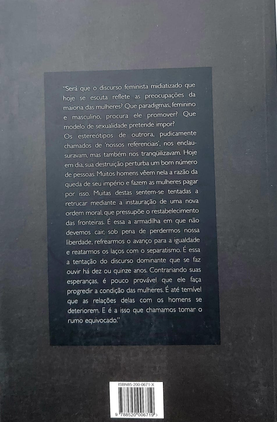 Badinter mostra que a mulher não pode cair na armadilha dessa nova ordem moral, sob pena de perder sua liberdade, refrear o avanço para a igualdade e reatar os laços com o separatismo.